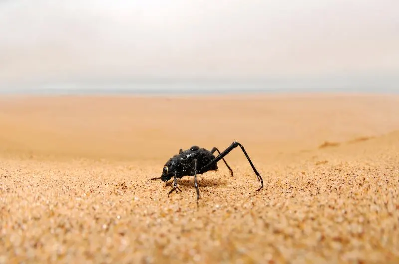 Dazu balanciert der Käfer hoch oben auf einem Dünenkamm mit dem Kopf nach unten gesenkt und streckt sein Hinterteil nach oben zum Wind – einem Kopfstand gleich. Der Nebel kondensiert in kleinen Tröpfchen und das Wasser fliesst über die Rinnen seines Rückens direkt in seinen Mund.
